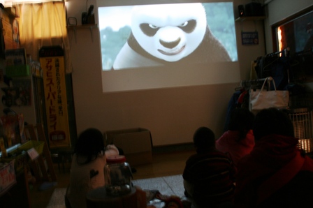 手に職ある父ちゃんたちが仕立ててくれた映写音響装置を活用しての200cm大スクリーンによる映画上映会。